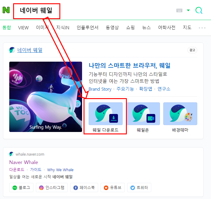 먼저 네이버 검색창에 네이버 웨일을 검색해주세요. 그리고 아래 이미지처럼 웨일 다운로드를 클릭해주세요.