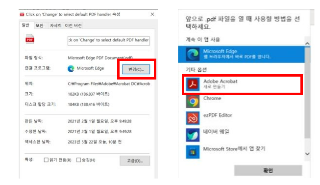 그리고 연결프로그램에서 변경을 눌러줍니다. 기타 옵션에서 Adobe Acrobat을 눌러주세요. 그리고 확인을 눌러주시면 됩니다.
