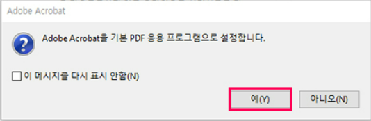 다운로드가 완료되었으면 아크로벳 리더가 자동으로 실행됩니다. PDF응용 프로그램으로 설정할지 묻는 창이 나옵니다. 예를 눌러주시면 앞으로 PDF 파일을 바로 읽으실 수 있습니다.