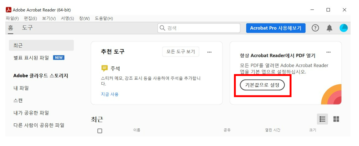 만약 잘못눌러서 창이 없어지신 경우에는 다음과 같이 해주시면 됩니다. 다운로드가 완료되었을 때 Acrobat Reader 프로그램이 실행되었을 겁니다. 프로그램에서 홈 화면에 항상 Acrobat Reader에서 PDF 열기 항목에 '기본값으로 설정'을 눌러주세요.