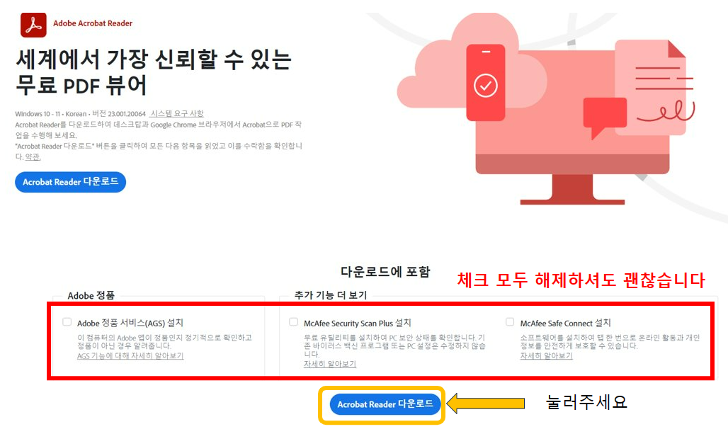 홈페이지에서 Acrobat Reader 다운로드를 눌러주세요. 처음 체크되어있는 3개 항목은 모두 해제하셔도 됩니다.